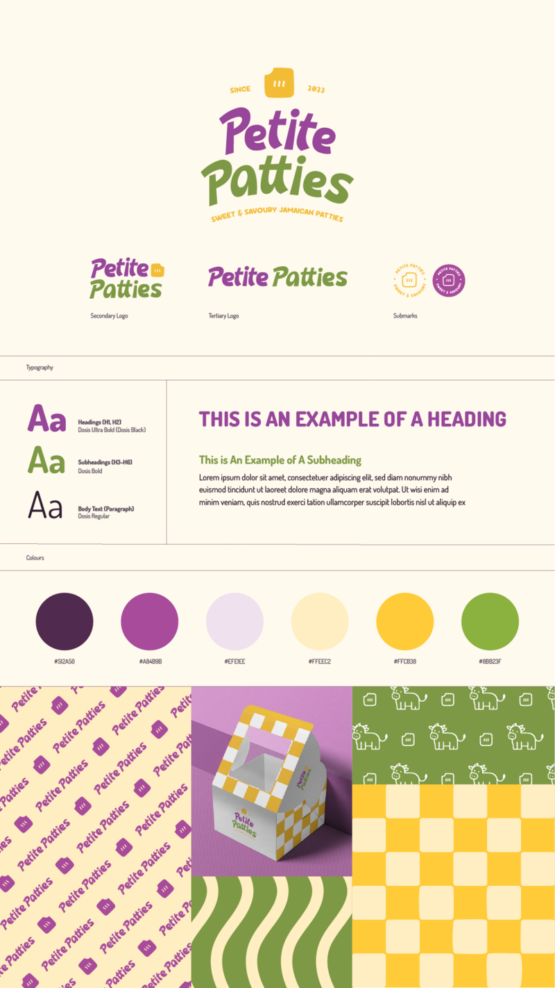etite Patties is a bold, joyful food brand that reimagines Jamaican patties with a twist—introducing dessert flavors and high-quality ingredients that blend Caribbean heritage with North American flair. Designed for curious food lovers, busy eaters, and those with dietary restrictions, Petite Patties offers convenient, locally made treats that spark childlike joy. With vibrant colors and a fun, approachable vibe, the brand aims to stand out on shelves and pave the way for its sister venture, The Dessert Artist.